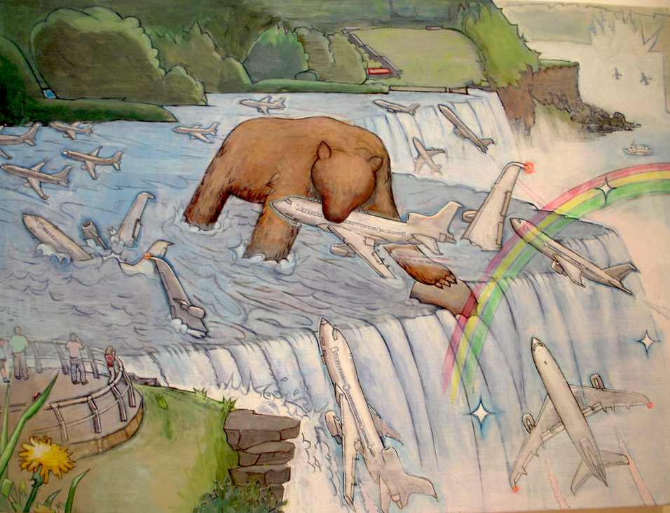 Sakaguchi’s pastel-colored drawings and paintings, with their crisp illustrational lines and improbable action heroes (a hiker strides a log attached to the wings of two, side-by-side, in-flight airplanes) evoke a cartoon world where everything is larger than life. While there is no clear story arc to the ensemble of works, a loose narrative is suggested—something dreamy, lonely and, ultimately, contented.