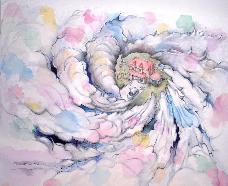 No bloodshed though. Sure, there are spewing volcanoes, a swirling hurricane and, most memorable, a giant marauding brown bear. These are archetypal depictions of what happens before storm or battle. Like Dorothy’s besieged farm house in Kansas, Sakaguchi’s house, in the oil painting, “Eye of the Hurricane,” stands alone, sitting calmly before it is swept up. His candy-colored hurricane is like a polka-dot-clad clown threatening with a water balloon.