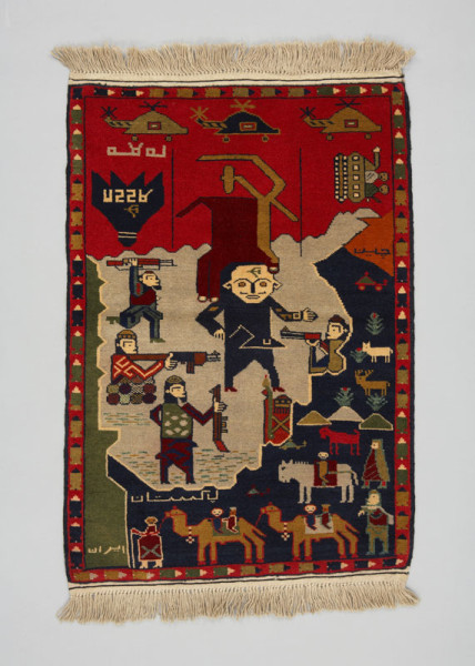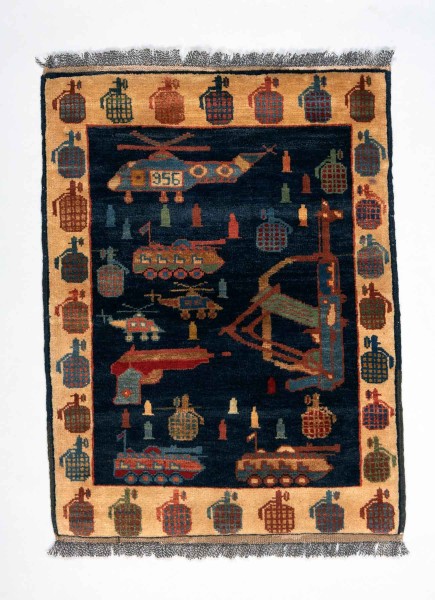 I was totally intrigued with Afghan war rugs (sometimes referred to as Kalishnikov carpets) when I saw them several years ago at the Troppen Museum in Amsterdam, but they have been little exhibited in the U.S. This is a chance not to be missed. The tradition of tribal rugs in Afghanistan derives from the central Asian Turkmen and Baloch tribes, and only attracted Western attention in the late 19th century. Afghanistan has been a continuous battleground since 1979 when the Soviets invaded, and one consequence is the largest community of exiles in the world (6.2 million in 1990), living primarily in Pakistan and Iran where peoples from all over Afghanistan mix. Some time in the 1980s, Afghan rugs began to appear with new motifs: the instruments of war. Their origins are uncertain because of the extensive mixing of exiles and the many hands through which the rugs pass before reaching the West.
