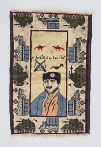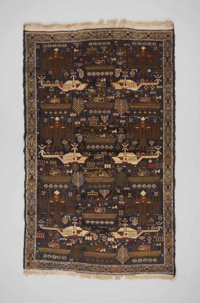 It’s hard to imagine another exhibition that would be of equal interest to members of the AIA (Archaeological Institute of America) and the NRA (National Rifle Association), to subscribers of Hali (the leading publication in the world for carpets, textiles and Islamic art) and readers of Soldier of Fortune (the mercenaries’ monthly). Battleground: War Rugs from Afghanistan at the Penn Museum through July 31, 2011 is the first stop on a U.S. tour organized by the Textile Museum of Canada, Toronto; it is likely to amaze most viewers and will fascinate anyone curious about the world, the impact of war upon civilians, international visual culture, the flexibility of women artisans and the place of traditional crafts in the Twenty-first Century. It shows the extraordinary products of the merger between ancient tribal craft and the most advanced of technological equipment: computers, fighter jets, armed tanks, as well as the somewhat more old fashioned tools of war: Kalashnikov automatic rifles, hand grenades and land mines.