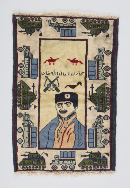 The intended audience for the rugs is equally uncertain. Prof. Brian Spooner, curator of Near Eastern Ethnology at the Penn Museum and a specialist in Afghan rug weaving, suggests that the earliest war rugs were designed for Soviet tourists, and after 2001, for the U.S. military. This does not explain the designs, several of which are on view, that celebrate the Soviet withdrawal and also picture Afghanis fleeing the country by foot and on camels, followed by women bearing goods on their heads (see the rug depicting Najibullah, below). Spooner describes the war rugs as an effort to respond to an international market and quotes a local dealer that men provide designs for the rugs, which are mostly woven by women.