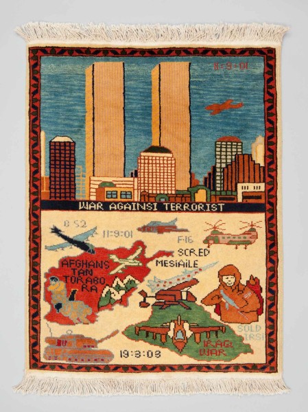 The exhibition divides the rugs according to general type: one group depicts maps of Afghanistan, occasionally its bordering states or areas beyond; another group commemorates Afghan heros (above); some show modern cities in Afghanistan (such as an aerial view of Kabul, with a border of helicopters that accurately reflects the city’s regular aerial surveillance); a few depict the twin towers of the World Trade Center (below). The most gruesome rugs show adults and children who have lost limbs to land mines; the most common mines are butterfly-shaped and are sometimes represented abstractly, at other times by images of actual butterflies.