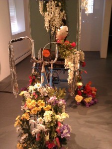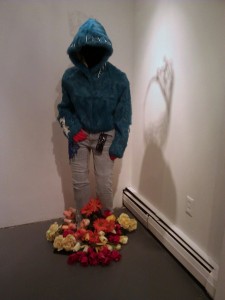 And now an installation at 40th Street A.I.R. this month shows the funeral arrangements, the bike, the mass cards (with Tupac lyrics on the verso), the floral arrangements, a stuffed version (Beverly stuffed it) of the real suit of clothes Morales performed in, her empty shoes, a portrait of the dear departed, and a taxidermy head of a deer departed, a church candle stand, incense, and the video of the original event. Everything is decorated to the nines in flowers plus stuffed animals, real and faux.