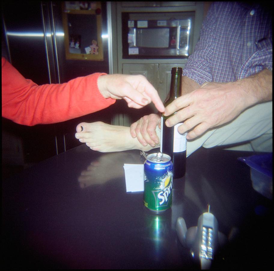 Blake Andrews‘ photos are highly interiorized views of people, places and things. They are like snapshots, with flash, of small moments or things that may not seem important to you, but might have been important if you were there. A shot of disembodied hands (and a foot) coming together around a beer bottle is part of a larger scene but you don’t get to see the big picture; that’s irrelevant in Andrews’ almost secret-coded enterprise. The pictures don’t feel like “bad” photos or toss-offs that wouldn’t make it in your photo album, however. They are deliberative, and each has something weirdly expressive of the human condition that keeps you looking.