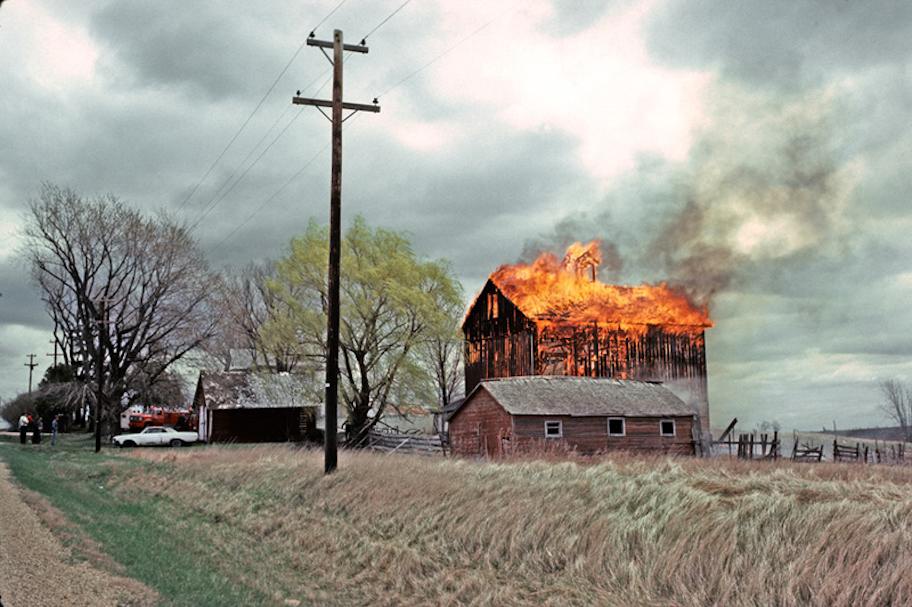 Chuck‘s photographs stand out for their beauty and for the ease with which they haunt you. That cover photo, from 1981 — a rare instance of early color photography by Patch — is full of death in rural America or maybe the death of rural America. Following the recent spate of twisters in the Midwest, Plains and South, this image of what probably is a disaster (do people intentionally burn down barns to get rid of them?) achieves that rare sublime beauty that horrifies as well as seduces.