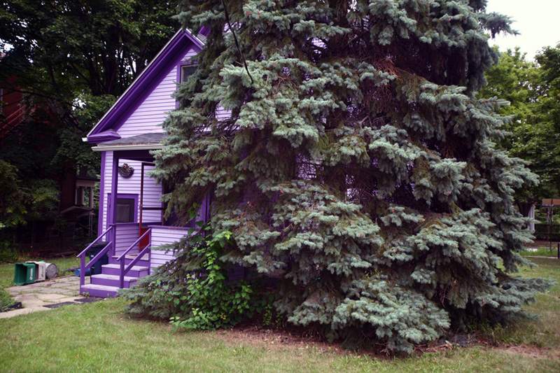 Mark Alor Powell, one of the artists featured in depth, is a portraitist. His portrayals are both empathetic and quizzical. The images range from people to a non-human odd couple (a purple house almost swallowed up by the enormous evergreen next to it). A photo of a youngster smoking a cigarette with smoke coming out of his open mouth and little puffs of smoke covering up his eyes is striking, in spite of the “smoke gets in your eyes” reference.