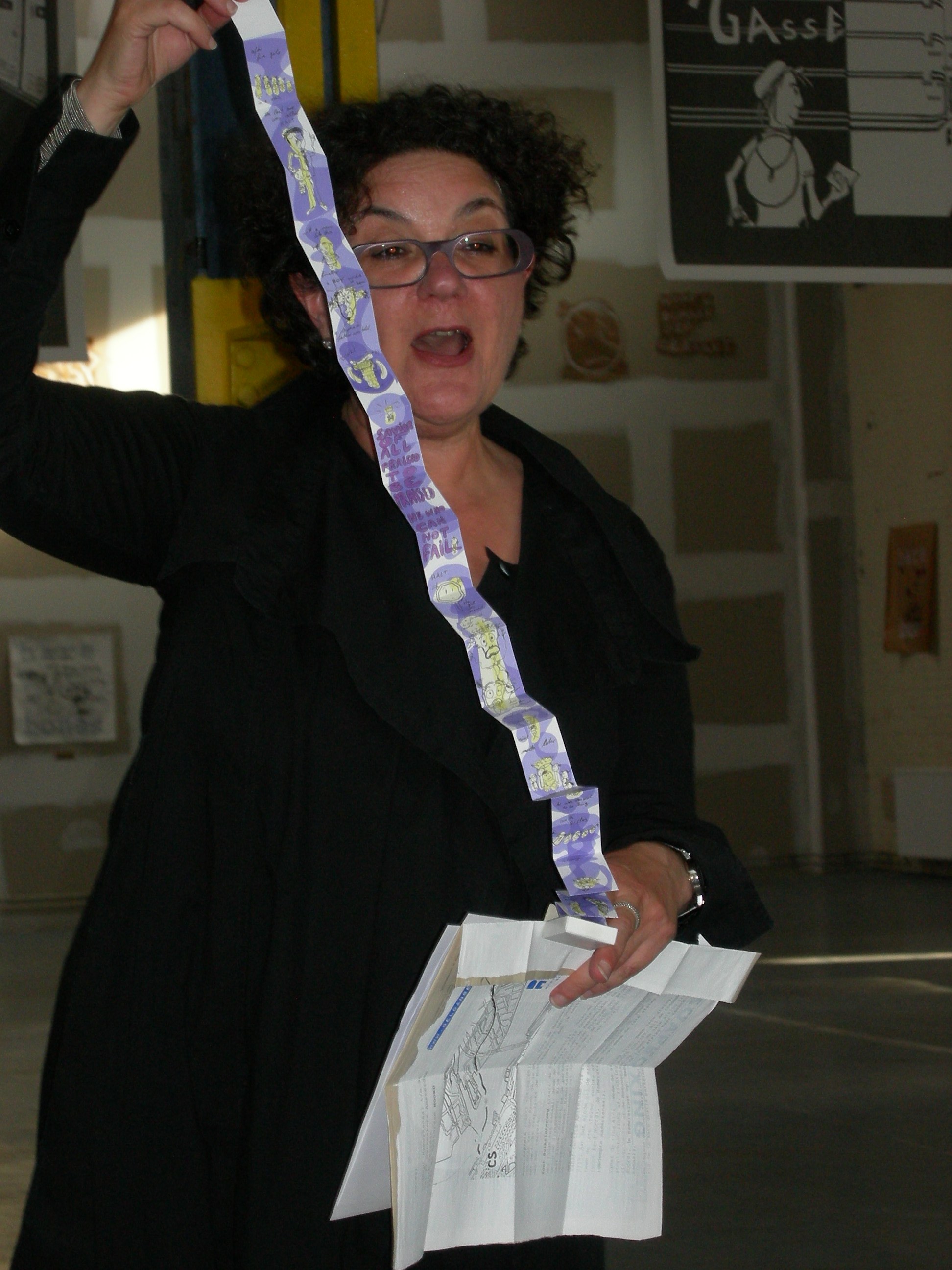 Suspended above eye level were 80 poster-sized prints from, Zakkum, billed as a graphic murder mystery. It’s to be published in chapbook format later this summer by Treehouse Press. The story concerns family, loyalty and love, cultural etiquette and taboos, and social conventions about gender; although fictional, it was inspired by the death of Sezen’s aunt. The drawings had been shown in the Womens’ Museum, Wiesbaden in 2009.