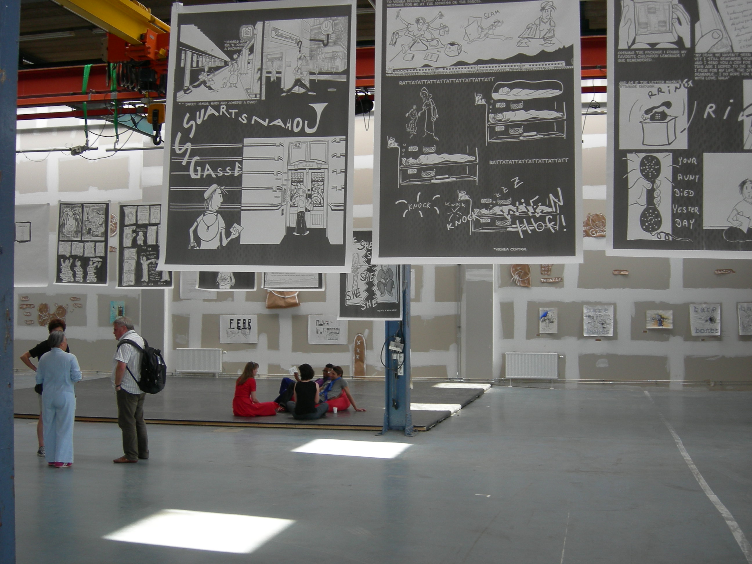 On arriving, I rented a bike and took a ferry to Amsterdam North with my friend Barbara Krulik, who says the neighborhood is otherwise known as Brooklyn, because it has cheap real estate where artists can afford work space. We went to attend the opening of drawings by Beldan Sezen, a Turkish German who lives in Amsterdam. It was held in a raw industrial space which is the new home of Dansmakers, an incubator of choreography and collaborative work where Barbara is managing director and Sezen records activities as a videographer.