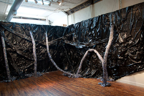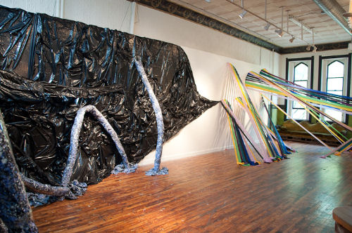 Entering the gallery, you are confronted with the imposing installation of Chelsea Coon, a Boston based artist. Known for her drip paintings that resemble the rich star-fields from Hubble space images, here she uses those pieces as starting points, which she then rolls around wire skeletons, making long, hollow tubes out of them. These paper tunnels then criss-cross and snake from the floor to the huge, black trash bag-covered wall. The piece is ugly, dark, and foreboding. The handling of the materials is loose, creating a cragged, interior world that seems grindingly claustrophobic. Dissonance reigns as the shiny crinkled trash bags shine behind the greyish matte tunnels. The placement of her protruding tunnels is random and feels as if they have metastasized by accident or surprise.