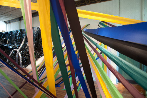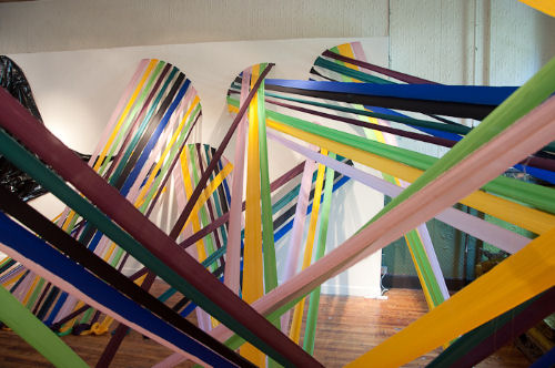 If Coon’s world is raw, cragged, lugubrious, and dark, as you emerge onto Bowser’s side of the gallery you end up in a bright, airy world of colorful beams of soft fabric that seem to glow like radiating plumes of rainbow-colored light. Multicolored bands of pastel fabric are stapled to the walls of the gallery along soft, imaginary arching lines. The tautly stretched fabric bands travel in a parallel trajectory at random angles across the room, thereby creating a large web of sharp, interlaced forms. You can walk into her installation and become immersed in her playfully positive world. In fact, when Coon’s dark, ominous world is viewed from inside Bowser’s pastel beams, it feels as though you are protected and safe, inside an almost heaven-like womb.