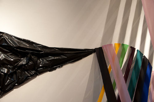 Poetically, the two opposing artworks kiss at the center point of the installation. When Coon’s trash bag wall tapers into a tongue-like arc, and as you follow the line, you slip from her world onto a curved section of Bowser’s alternate world of light. That spot where alternate universes may meet remains a mysterious, elusive, and beautiful place to contemplate.