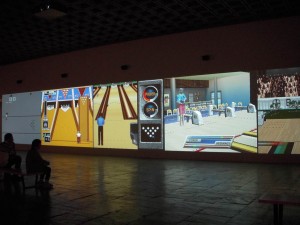 Arcangel’s video bowling and golf games are rigged for failure — the bowling balls are programmed to hit the gutter each time; the golf balls go into the rough no matter how hard you try. Games for Sisyphus, the un-winable activities play on forever, with “new low score” of 0 flashed on the screen repeatedly. It’s funny and poignant too. The bowling games in particular, projected side by side on the wall and with upbeat electronic video game music swelling as if for a bunch of winners, are full of downbeat grandeur.