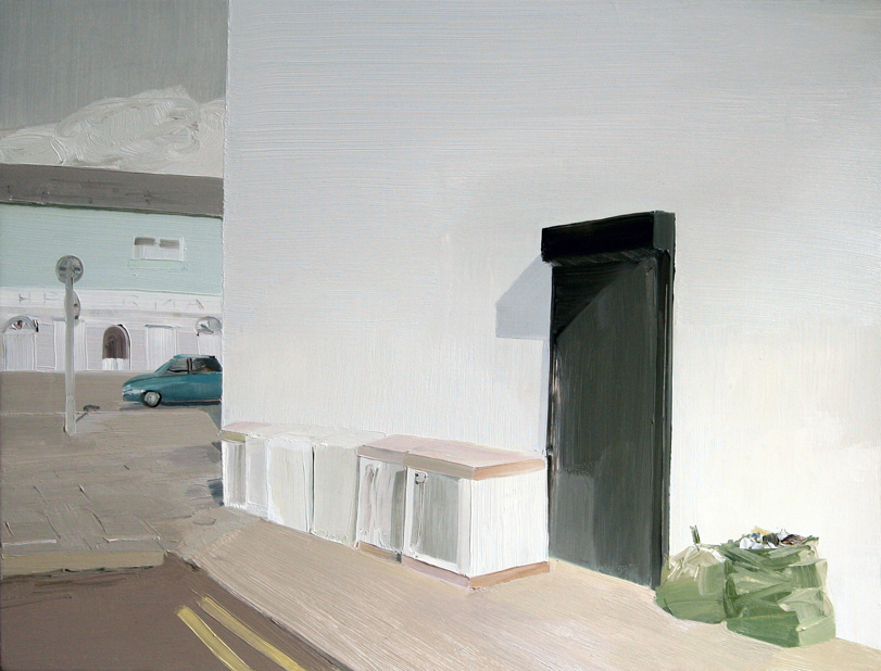 The exhibition’s title directs us to a center which is always missing, for the paintings are particularly un-centered and without focus. The wall in Church St., Gorey, Wexford obscures what might be a view beyond, yet offers too little to hold our interest. Like Gertrude Stein’s famous description of Oakland, there is no there, there. One scans the abject sites for meaning and understanding which they never reveal. Some of the forms do not even resolve; what is the box-like object in front of what is presumably a mural on a courtyard wall in Workyard, Smithfield, Dublin? Or the formless, white shape on the far left of Enclosure, Unyoke, Wexford?
