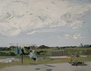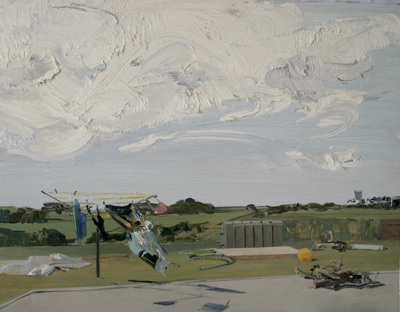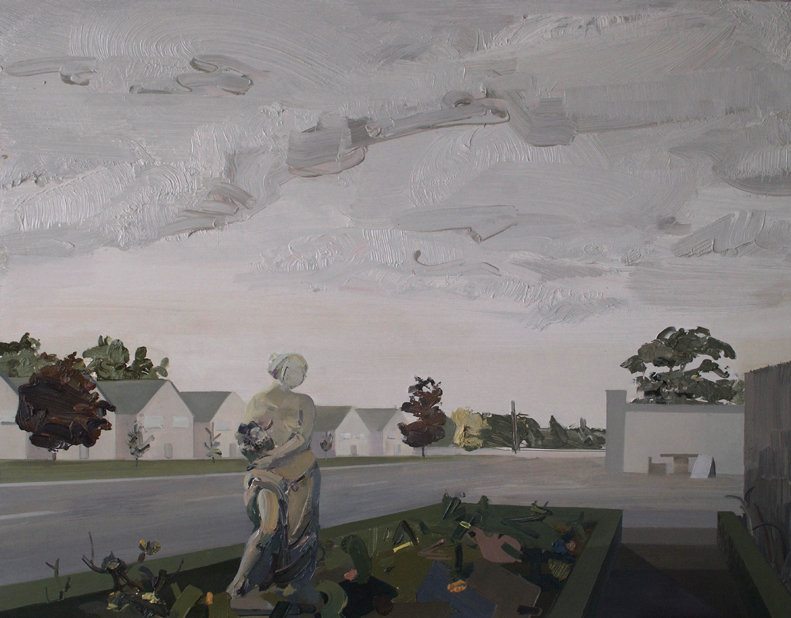 Mairead O’hEocha’s paintings are a stealth project. Her exhibition, via An Lár (An Lár is used on Irish road signs to indicate the town center), at Trinity College’s Douglas Hyde Gallery (through July 13, 2011), consists of purportedly deadpan views of contemporary Ireland. They’ve been accepted as such by critics and by the curator who wrote the introduction to the exhibition, which places O’hEocha in the tradition of Corot, Morandi, and Maureen Gallace (who does, indeed, paint deadpan Irish landscapes). These viewers have been taken in by the paintings’ craftsmanship, the subtlety of their restrained pallet, and the enduring popularity of landscape in Irish art and imagination.