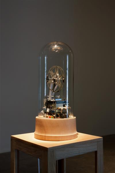 The installation consists of a back-projected, 10-minute, 16mm film of the burial procession; the ticker-tape machine, sitting under a glass bell jar on a pedestal and continuously extruding printed tape; and a stack of the newspaper On Hoarding… free for the taking. The film is in the traditional format of hand-held documentary; the only sound in the gallery is the regular clicking of the film projector and the less frequent sound of the ticker tape machine as it prints. These sounds, and the newspaper, emphasize the obsolescence of the technology (celluloid film, ticker-tape machines and possibly even printing) which the artist has used in her project exploring obsolete currency and the impact of change on a community.
