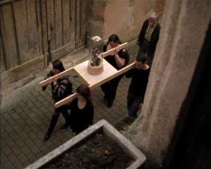Sarah Browne’s installation, Second Burial at Le Blanc at Project Arts Centre, Dublin, May 6 – June 25, 2011, is the artist’s version of an anthropological study of current European conventions of time, value, exchange and community, which she conducted in the small, French town of Le Blanc. As a bid for visitors and tourists, merchants and craftsmen in the town have chosen to continue doing business in francs rather than euros for the past nine years, until Feb. 17, 2012, the last moment they are legal. Browne explains that her work is both salvage ethnography (documentation of dying customs or rituals) and surrealist ethnography (attempting to make the everyday seem strange).
