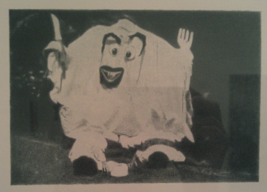 Drawing was surely not a main focus in this show, although there’s plenty of stuff we could recategorize to fall here–Wraga, Gonzales, Kelton and Pederson for starters. But the drawing that’s a drawing and none of those other things that is surely worth a mention is Scott Giblin’s pizza smothering two children with cheesy drips. The drawing is small enough to be overlooked in a room full of large pieces, a modest scale of about eight inches square executed nicely in a modest medium, graphite. Equally modest in demeanor is Giblin, whom we met at the opening. We pried out of him that he was one of the artists in the show, and he readily confessed that the drawing is based on a photo of an aggressive pizza that is consuming a couple of kids. At this time when horror movies walk the earth and dominate movie box offices, this Casper the Friendly Pizza treads where only The Blob has gone before. It looked fresh and new!