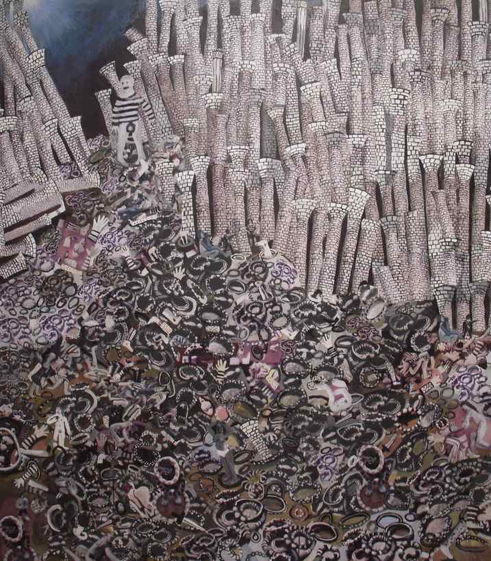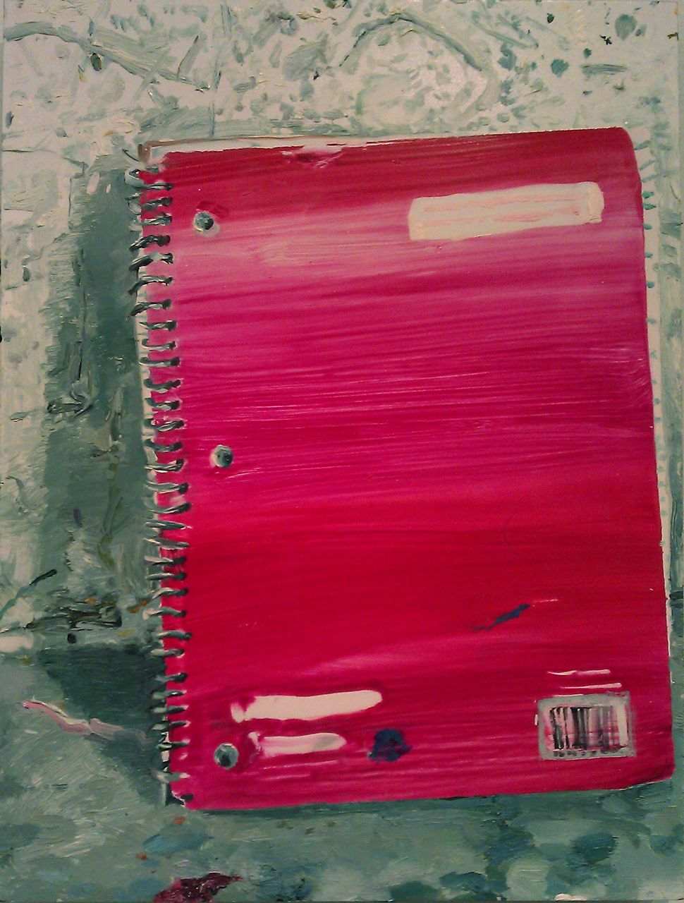 In contrast to Metz’ vision of Eden in this crazy economy, Lindsay Wraga’s painting with collage elements, After the Fall, is an armageddon of greed. More like a drawing than a painting–all outlines, largely grisaille, delivered with convincing obsession–the turmoil is palpable with quavering pillars of power about to topple onto piles of wealth–if only. Also taking on excess is Jaime Treadwell, who brings a sort of Candyland sense of colors and a kaleidoscopic sense of structure to life in the exhibitionist fast lane–all painted with traditional trompe-l’oeil oil technique. Hilary Doyle’s Pink Notebook captures a well-worn ordinary specimen of daily school life in all its well-worn perfection. The paint-handling hits the mark, capturing its distressed cover and wobbly spiral binding and at the same time capturing its iconic perfection as beloved–a companion, a friend, a confidante.