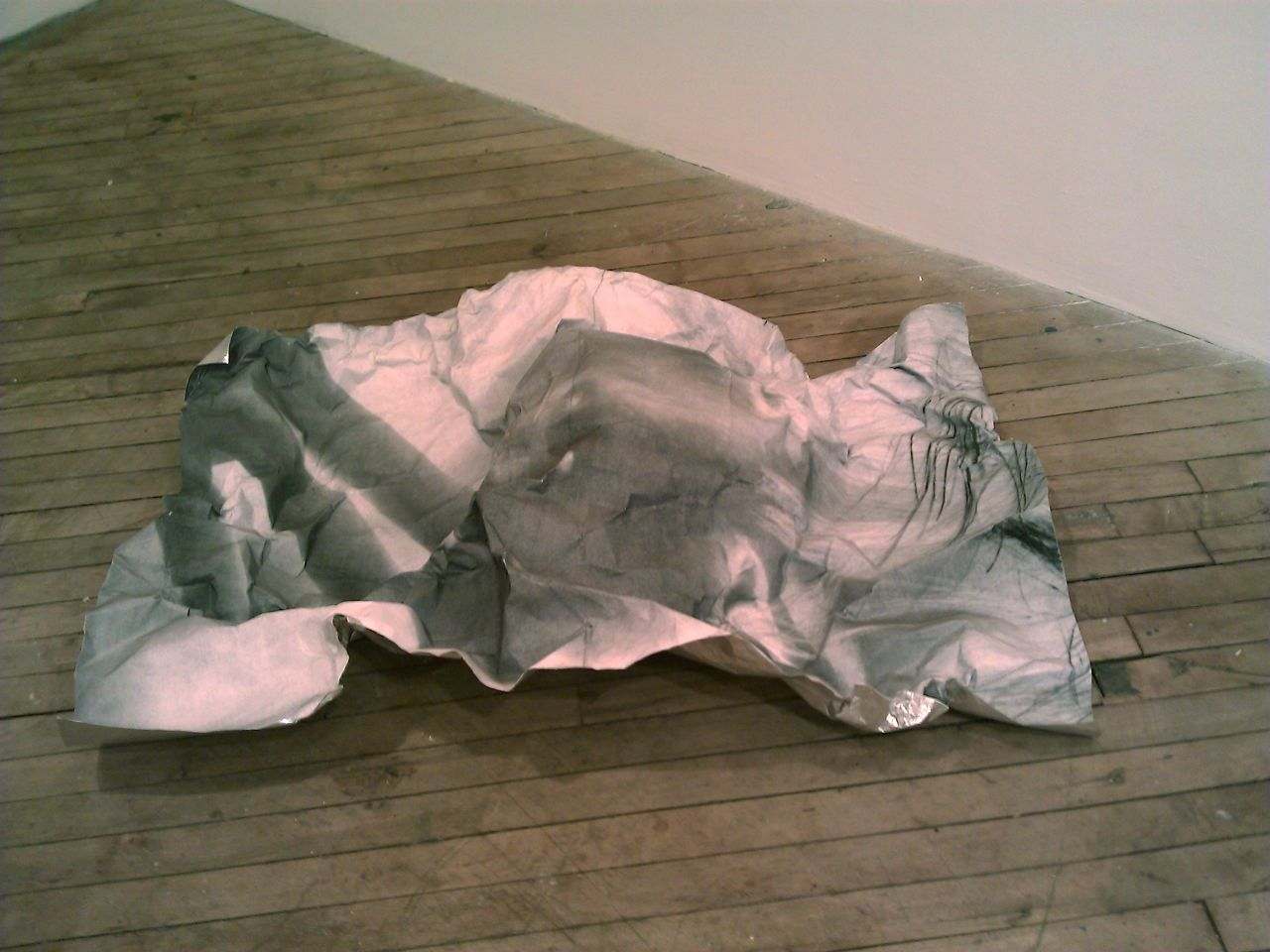 At the other end of the show in the back room is a pair of vulnerable paper sculptures by Bobby Gonzales. Decay is on his mind, we guess. The body is under threat in Sun Damage & Crepe Skin Under the Eyes, a super-sized photocopy on foil-backed kitchen paper crumpled like the crepe-y skin and tossed on the floor. A net of caterpillar tent-like paper strips enmesh struggling artificial flowers in, Gypsy Moths. The vase is a found object, the paper strips are photocopied paper. The off-hand materials in both pieces, and the mega scale and lack of pedestal in Sun Damage save Gonzales from Victorian vapors over the loss of beauty.