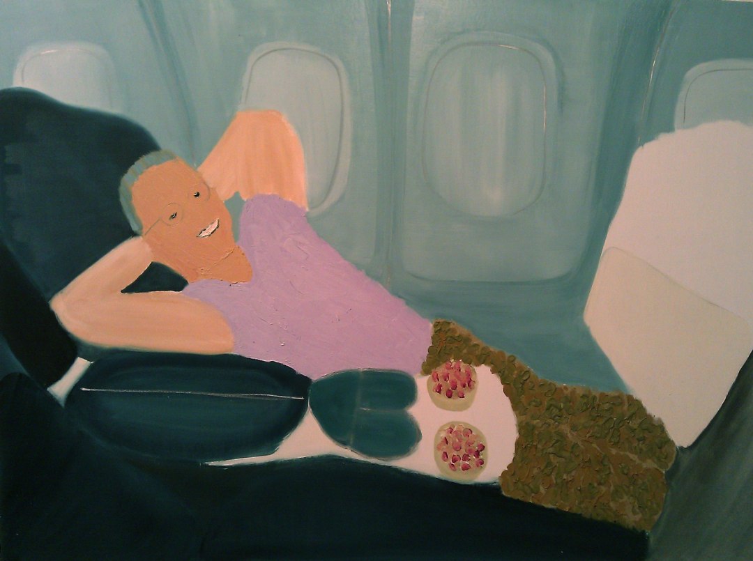 The paintings in the show deliver a convincing argument of its infinite variety. Jordan Graw manages to evoke early Alex Katz and Milton Avery even as Graw gives the lie to slick advertising that insults us daily with its seductive lies. In two paintings–Priority Number One and From Broadway to Tanzania–a traveler is pictured enjoying the discomforts of flying. A young man stretches out (oxymoron or do they really think we are morons?) in a cramped, reclining airplane chair, while his gloppy-paint pants and little candy dish grow the fur of travel-grime. In the other the traveler is a middle-aged tourist grinning in front of a white table-cloth-covered tray. Ha ha. What airline is this? His shirt of colorful paint glops is also the only touch of color and individuality–a threat to the corporate-dictated environment of the airplane.