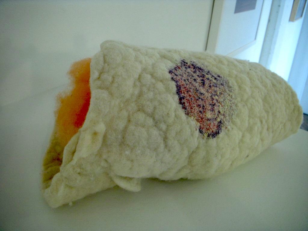 Jennifer Lingford’s Wound 4(Bruised Knee), unlike the macho majesty of the previous works, packs a punch demurely in a pedestal-top work of wool and embroidery thread that suggests a knee only, cut off above and below, and floating disembodied like a jewel to be studied and envied for its beauty. It is quite beautiful in fact, and soft-looking and stuffed-animal-like, until you remember it’s just a bruised knee. Funny.