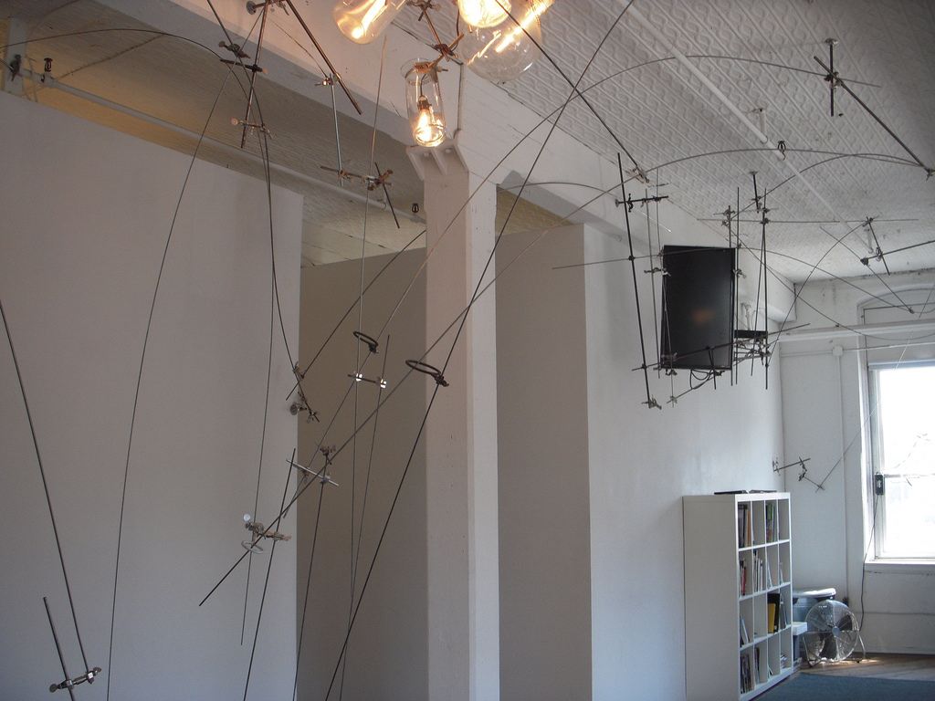 John Schlesinger’s installation “All That Remains,” a network of lab clamps, lab glass, low watt bulbs, steel, video, inkjet prints and silicone rubber, greets you in the gallery’s lobby space. The piece weaves itself through the space like a man-made web whose purpose is a puzzle.