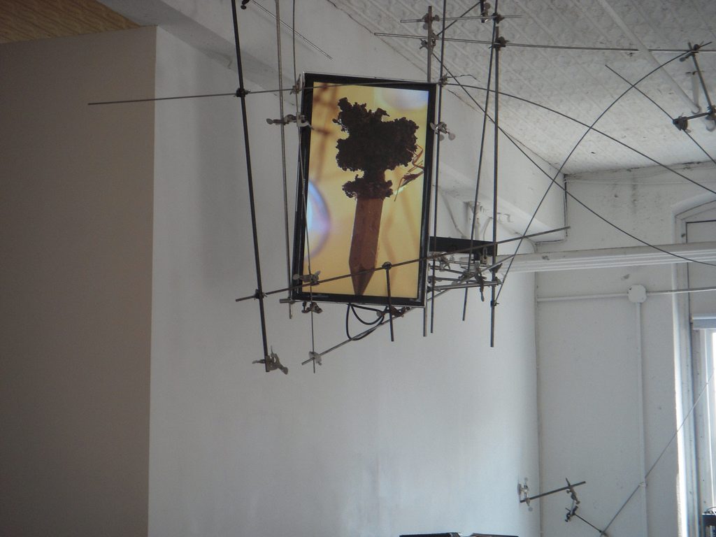 It does seem to trap a video player in it and on that video is an image of a plumb bob with a bushy top, something the artist made and says refers to Altzheimers, a condition that will make you lose your moorings like the top-heavy plumb bob. It’s hard not to read body into the delicate network of rods and nodes here. Far from exuberant and singing the body electric, this is a reference to the body that’s a shadow of its former self, a body reduced to parts that can’t sustain themselves.