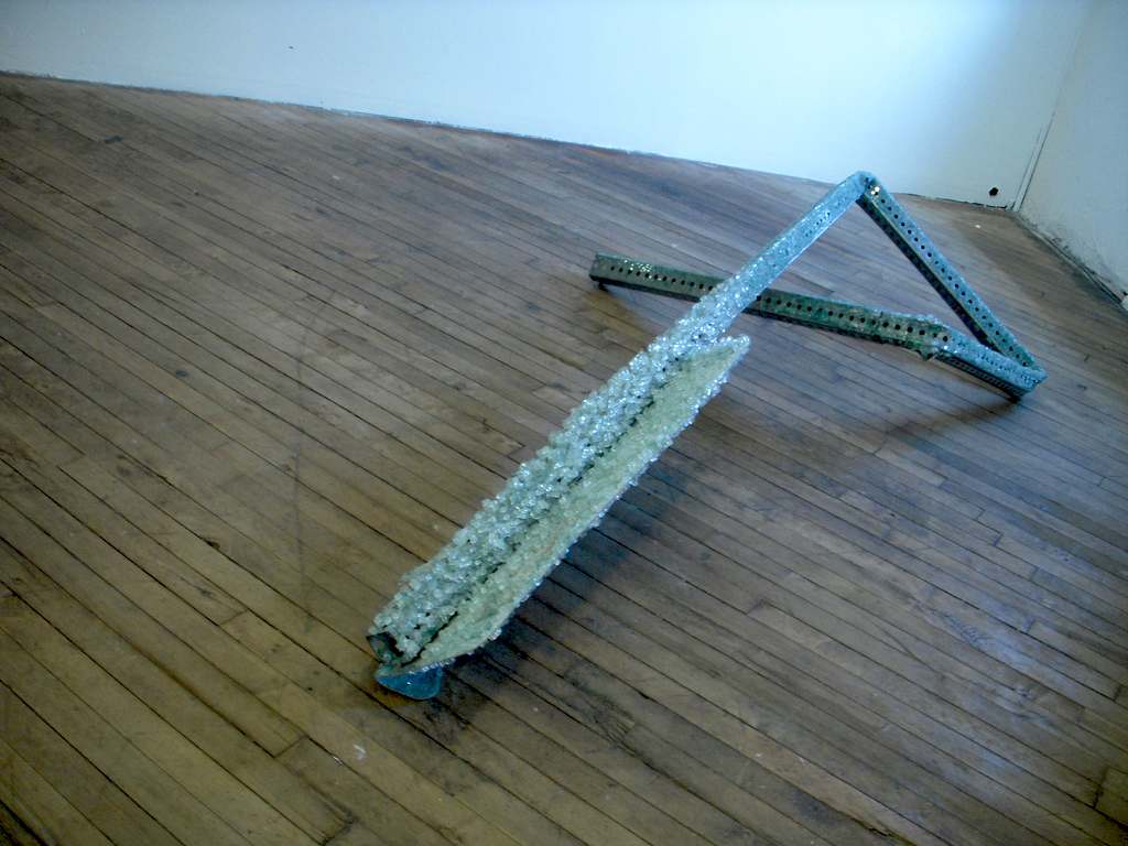 And Kevin McCullough’s “Sign” a glass-shard encrusted street sign doubled over on the floor is a nice object that brings up reveries of car crashes and glass shards on the street from car break-ins. It’s a large piece and needs more room for it to shine in than it has here.