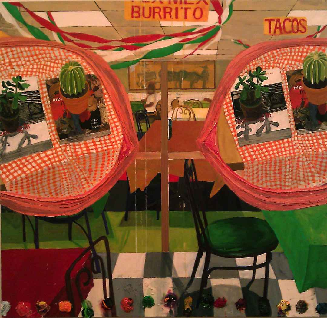 Dustin Metz’ Room with a View, switches the surrealistic trope of a dislocated view through rose-colored glasses to the view through a pair of pink-ringed eyes, making it both more personal and more sincere. Only the row of paint blobs across the bottom suggest this is as much about painting as it is about dreaming. At a time when we are all eating Mexican food on Girard Avenue or at the Italian Market, this painting is recording a bit of life as we know it–the new Mexican revolution in El Norte.