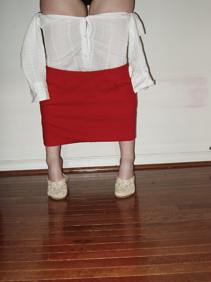 Milana Braslavsky’s White Shirt Red Skirt is odd enough to be a Diane Arbus update. Pictured is the artist (or at least her legs from the thighs down) wearing a red skirt that starts at her knees and goes to just above the ankles. She has a white blouse on top of the skirt, and that starts at the thighs. The legs are far apart in a bow-legged stance. It’s a funny take on fashion, and on little people, and perhaps, on wanting to be small when you’re not. Ben Goddard’s two photos — of sky writing in a blue sky and of a crowded room with a ping pong table — are nice, if nothing new.