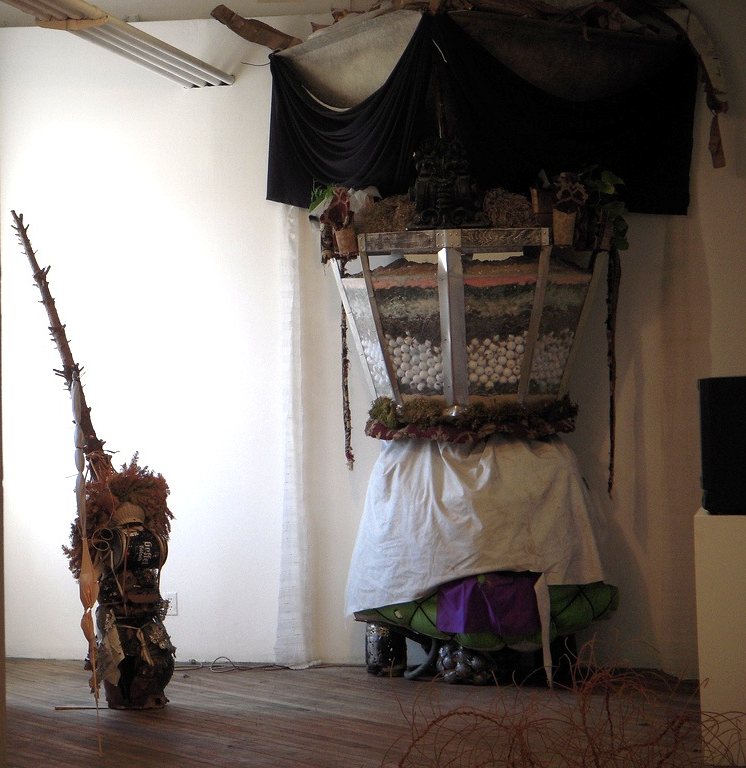 Nathan T. Wilson and Dante Blackstone’s collaborative pieces, one large (it scrapes the ceiling and towers over the back of one gallery) and one small like a sidekick, are found-object amalgamations that have the physical presence of a queen and her jester or maybe Don Quixote and Sancho Panza. The large piece has an hourglass shape covered with a white skirt at the bottom and with a bodice of clear glass through which you see topographical layers of stuff including pink foam insulation, what looks like dirt and hundreds of egg-like golf balls. Together with the smaller, jester-like figure, these two are a new tribe, both dramatic, ancient, and completely part of now. The pieces, by the way, have fanciful titles suggesting they are a royal sentinel (large object) and royal escort (shortie)