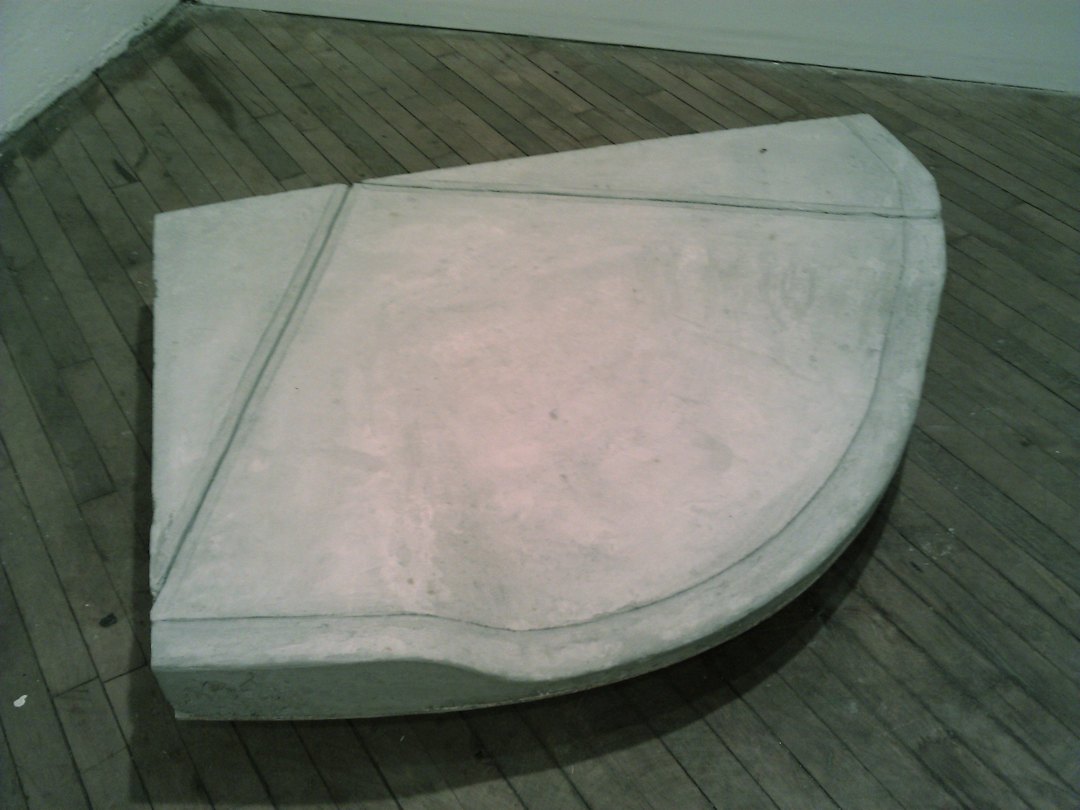 Right nearby, Daniel Petraitis’ elegant concrete replica of a sidewalk corner — curb-cut and all — floating above the floor on casters, threatens to skateboard right over Gonzales’ floor piece and crash through the walls, once it builds up a head of steam. The wheels and disconnection carry that doggedly everyday thing into a Platonic sculptural heaven.