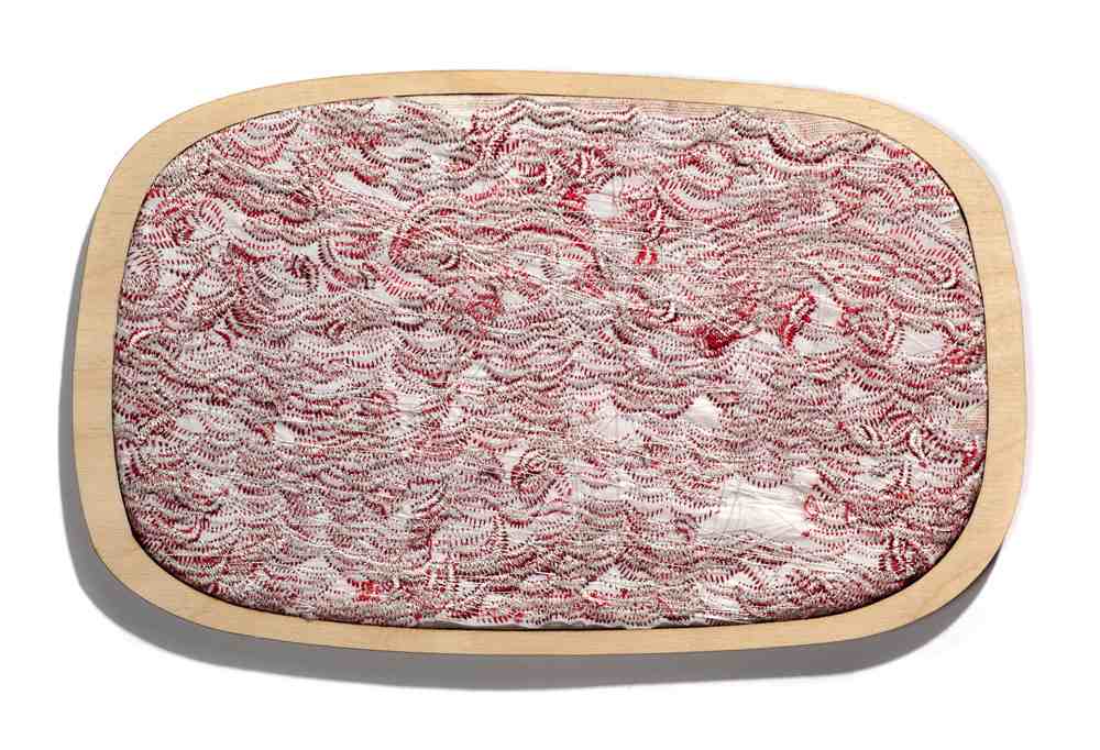 “Red Flood”, embroidery on fabric and laser cut wood frame, 13” x 9”