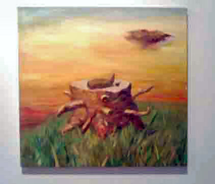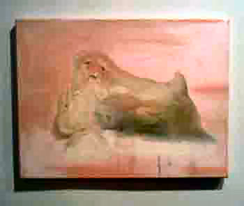 Gahee Park, a recent graduate of Tyler School of Art, paints with a fun and fearless approach to color and texture. The abstractness of her forms is only reined in with her declarative titles, as they give light to the paintings’ inspiration. Her point of view is one of satire as she easily lets go of profound conclusions and paints in an imaginative manner. “A shit with a fat fly and a bird” causes a smile to creep across your face when you think of the artist remembering or dreaming up this somewhat irreverent still life. Park’s variety of texture and defined forms keeps your eye moving and your mind playfully trying to fill in the blanks.
