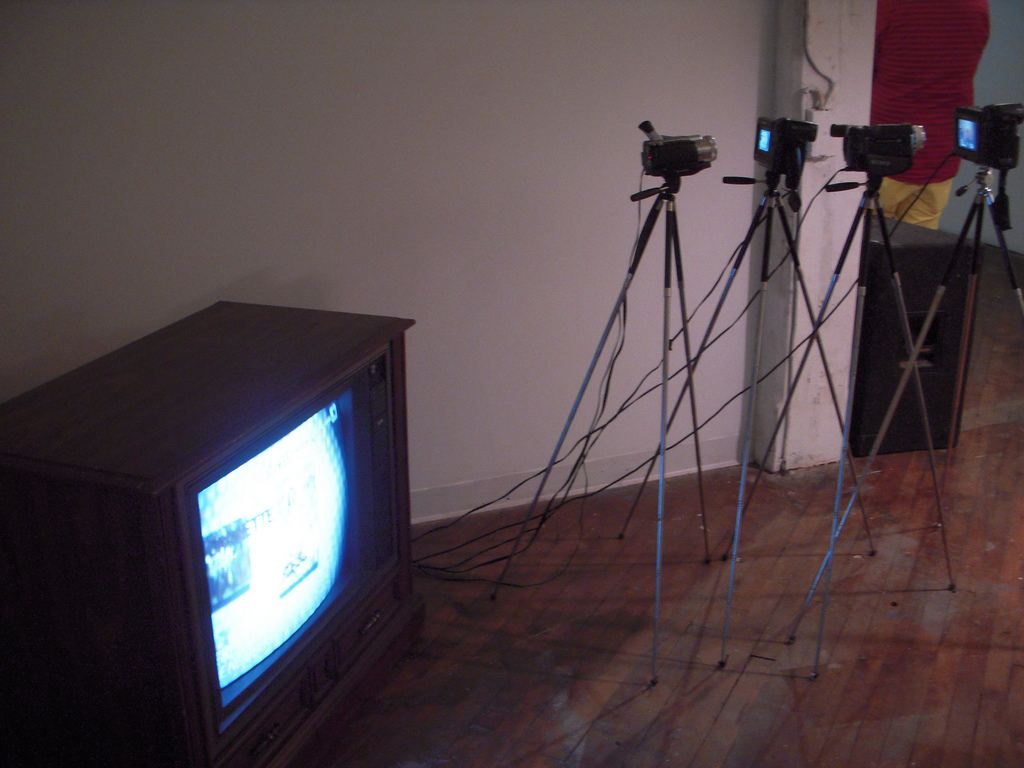 Just as Grilli lets uncertainty into his process, Brittany Papale lets distortion take center stage in her installation, “Whisper down the Lane.” Papale points a video camera at one of Park’s paintings, while three other camcorders follow suit. Each succeeding camera is pointed at the preceding camera’s pop-out screen.
