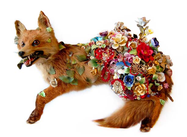 Adorning these creatures with leaves, flowers, and gemstones, she sometimes reveals wounds taxidermists worked to conceal. Her work has also generated controversy, specifically around humans’ treatment of animals. Singer’s art work can be seen in the exhibition The Enchanted Forest at Musei Civici, Palazzo S. Francesco, Reggio Emilia, Italy, until 31 August 2011 and at Strychnin Gallery, Berlin.