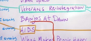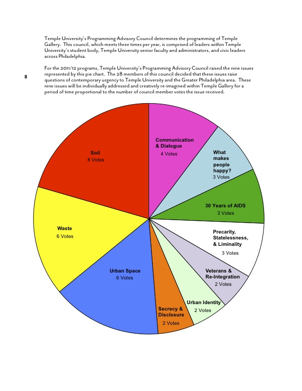 Working with a newly-convened 28-member Programming Advisory Council — which he polled for their thoughts on the really big issues — they came up with a long list of HUGE issues that “raise questions of contemporary urgency to Temple University and the Greater Philadelphia area,” he said. Some of the nine issues selected for programming include the growing AIDS crisis in Philadelphia; urban waste; the social/economic reintegration of our veterans; training of ex-cons; and our fractured relationship to Pennsylvania’s wealth of underground natural resources such as soil, natural gas, and water.
