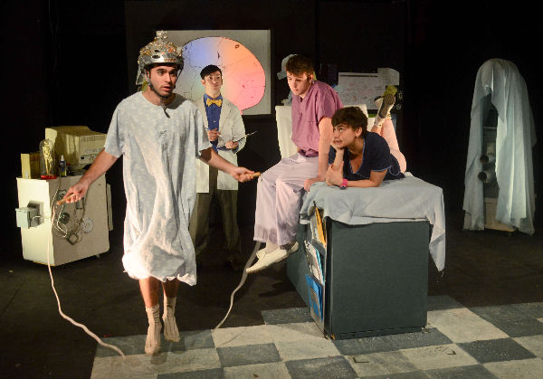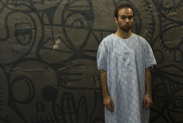 Max Reuben as Simon, feeling “more like a science project than a patient,” in AGGROCRAG’s “A Series of Tests;” photo by Jon Herman.