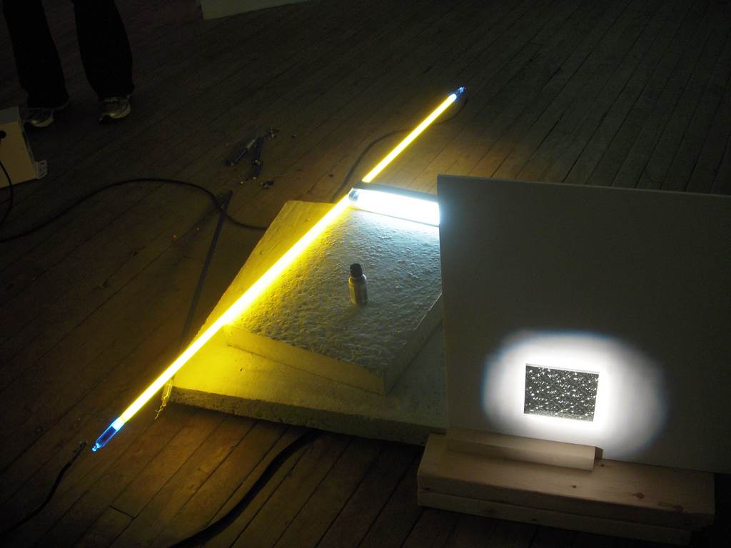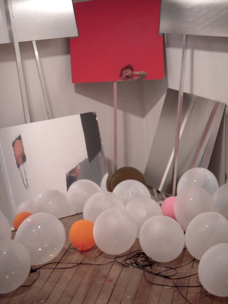 In the bright-lit gallery up front, Anita Allyn’s life-size installation, i heart postdemocracy, with balloons, reflective mylar-coated protest placards, mirrors and a low table, is another stage set. Allyn’s pre- or post-party installation (and the ironic title of her show) suggest the played-out actions of those who feel for/against a cause, policy, war, group, politician, but whose feelings are less articulable than the trappings of the protest. Hardly a call to arms, the work seems more a comment on and perhaps condemnation of civic engagement.