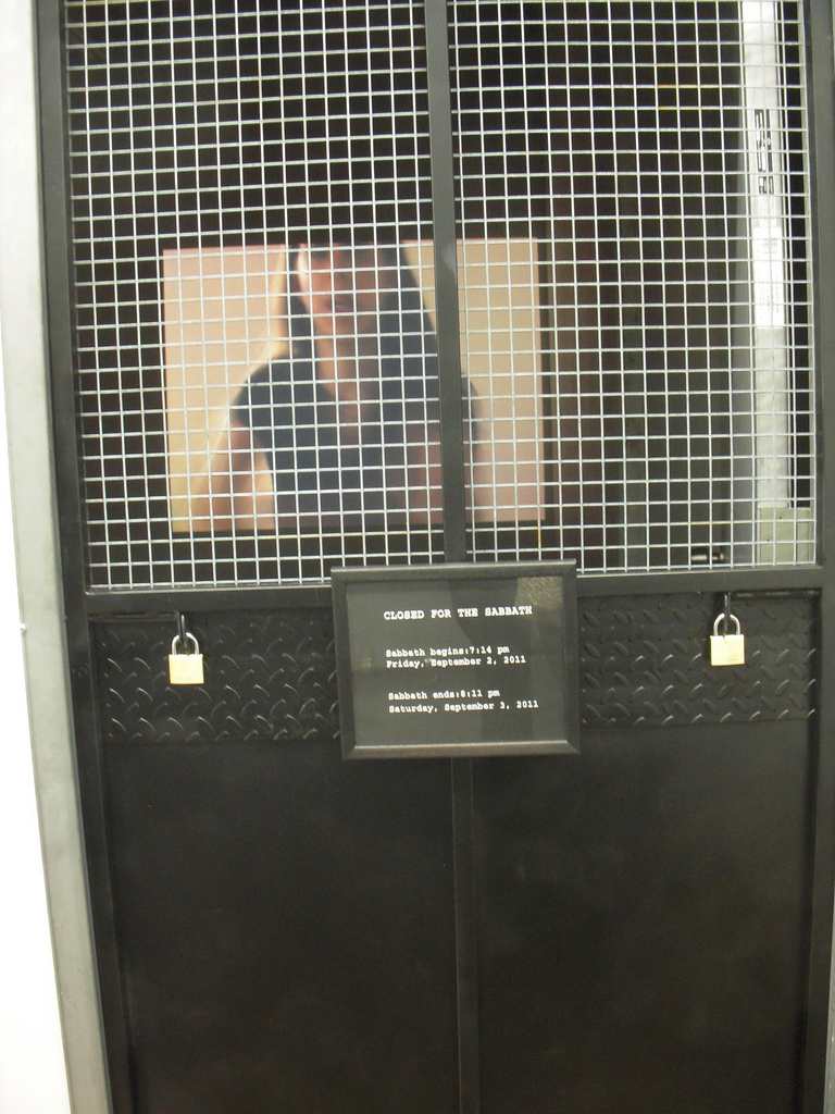 We walked up to Marginal Utility and were stopped by the gated and grated entrance to the gallery. The sign said they were closed for the Sabbath. According to MU’s David Dempewolf and Yuka Yokayama, this Sabbath closure is the wish of the artist Hadassa Goldvicht, a Brooklyn-based Israeli artist whose work is about ritual and voices and whose installation here is called Songs for the Peacemaker. In the dark gallery space, visible behind the grate is a video projection of a woman speaking, and this image behind the grated door conjures lots of ideas about prison, war, police states, harsh economic conditions even. The artist was in Italy at the time of the opening but would be back later in the month to install some additional work. Dempewolf met the artist at Skowhegan, he said. And another artist named David, David Carrow, created the door specially for the exhibit. David Carrow is a poet in metal and the door, while forbidding, is elegant and beautiful.