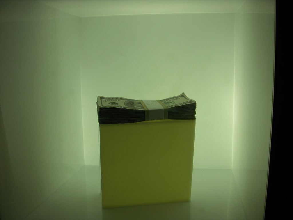 There’s one life size element — a really great-looking object — a box inset in the wall holding what appears to be a stack of large denomination bills. The glass-enclosed case is lit up like a jewel display in Tiffany’s. Everyone’s holy grail is money, whether you’re an artist or work on Wall St or at MacDonalds.