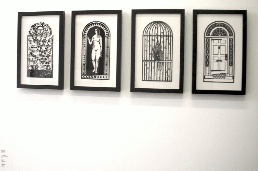 And it’s great to see Joe Boruchow’s cut paper works here. The virtuoso pieces are the basis for some of the artist’s recent street posters–you’ve seen them on mail boxes and elsewhere around town. Also in the show Shelby Donnelly, Hannah Rose Dumes Nelson Figueroa, Anna Gray, Ryan Wilson Paulsen and Ryan Parker.