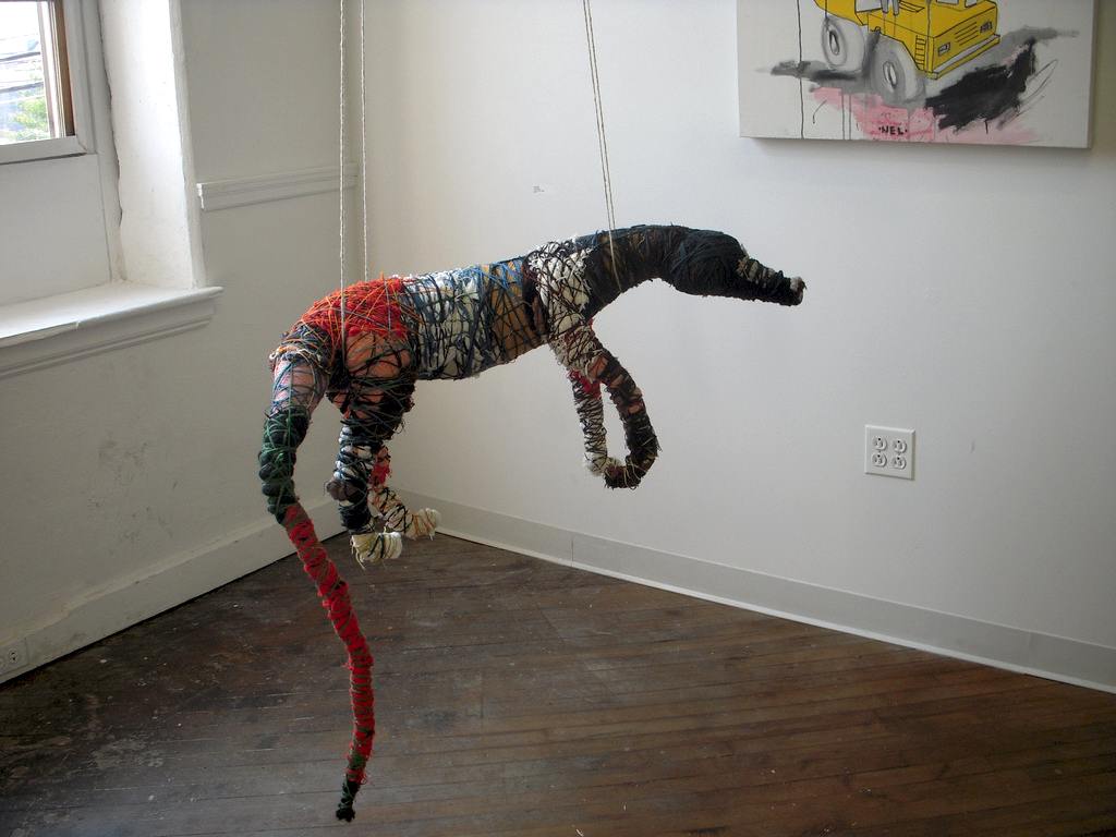 Perhaps because it is a large hanging object, Loo Bain’s “Fixed Strays” made of yarn, thread and string, has a big presence in the show. Backlit by the window and swaying in the breeze, it’s the piece you gravitate to first in the show. The colors are totally upbeat, but the hanging animal harkens back to the dark work of Berlinde De Bruyckere (featured in ICA’s Springtide show in 2005) who also suspends animals or animal-like creatures in the air (or on plinths) to suggest commodification. (See also, Maurizio Cattelan’s suspended horse.) I’m not sure that’s what’s on Bain’s mind (commodification) but it’s a reference for sure. Apparently the artist was going to use this structure an an armature for another piece but decided the armature is the finished work.