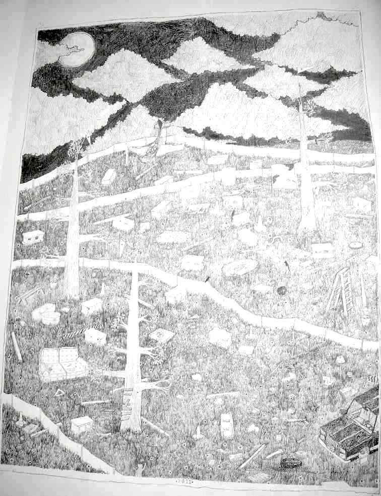 The tiny gallery looks great with a big group show in it! Commonplacing is the debut curating show by members of Napoleon; the members each selected one of the eleven artists in the show. Pay attention in particular to the wall drawing by Max Seckel, a marvel of control over a difficult surface (stucco). Described by Leslie Friedman — there when Cate and I visited — as a landscape with a Where’s Waldo aspect, the cartoon landscape is dotted with tiny references from the artist’s life. Seckel is a Space 1026 member.