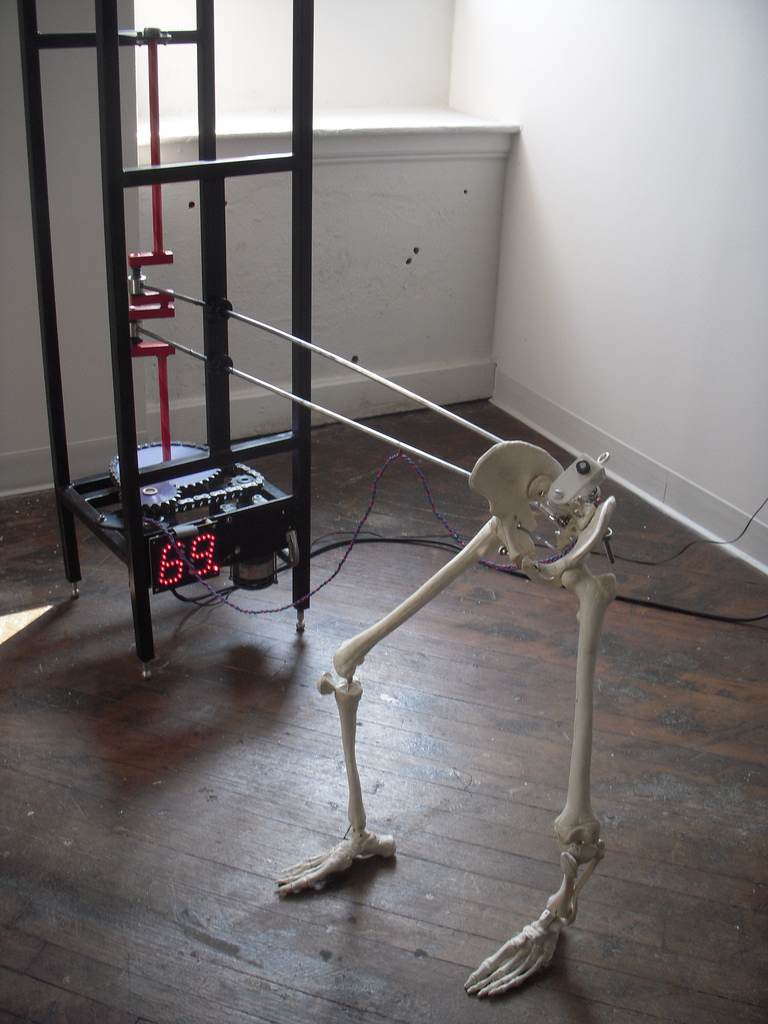 Belknap’s motorized skeleton somehow conjures the ambiance of a post-life The Dude with his loose-limbed, sandal-footed amble. Alexis Granwell, who was gallery sitting, said that the piece had been and was supposed to step more lively. But to me, the slow, almost-drunken movement more closely suggests the elasticity of time and its unstoppability. The digital read-out reinforces the idea of time and speed as well. Belknap has a solo show at Rebekah Templeton, and Dennis will tell you about that soon.