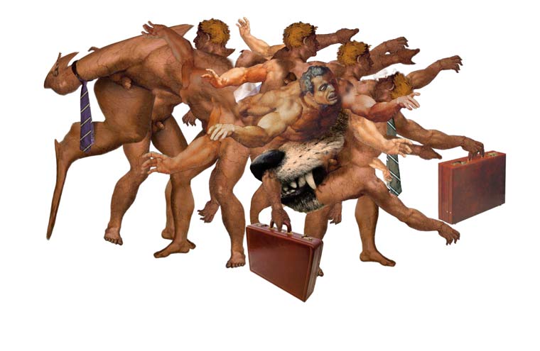 A simple thought-experiment has driven most of my art-making for the last 15 years. In this fucked-up world we live in, it is a sad truth that each corporation is legally a person. Crazy, right? My project started with an image that popped into my head – of a bunch of business suits all joined together into a monstrous, quasi-sexual multi-body. I started to play with the idea sculpturally and quickly understood that what I was doing was imagining a body for this insane legal/social fiction of the Corporate Person. My mission has been to pull back the curtains to expose the grotesque, invisible body of this creepy, psychopathic monster that is surely the dominant life-form on Earth, if we accept it’s Personhood. Kind of like Dorothy and the Wizard, but I’m still waiting for my ruby slippers, goddamnit. Why the Sistine Chapel? I started to think about the back-story of the corporate life-form and wondered what a corporate religion would look like (other than the obvious Worshiping of The Profit). An image of the Corporate God passing the spark of life along to the Adam Corporation came to mind, and it followed from there. Michelangelo’s hilarious, sublime, subversive Sistine Chapel frescoes are amazing source for material to explore and to reimagine and, you know – he wasn’t a half-bad painter and I only steal from the best.