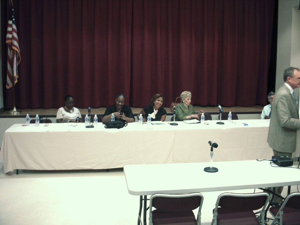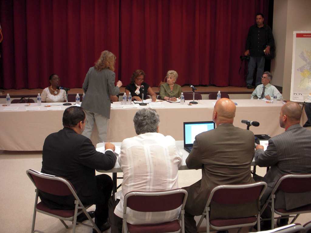 Last Wednesday Steve and I went to a City Council hearing on redistricting at the Nueva Esperanza Academy Charter School on Hunting Park Ave. This is one of three public hearings. It was scheduled at a time, 5pm, when citizens could attend–unlike the previous hearing at 10:30am, Aug. 16. The auditorium was pretty full of people, and the Council representatives — Anna Verna, Marian Tasco, Wilson W. Goode, Jr. and Maria Quinones Sanchez (joined later by Darrell Clarke) sat and listened. Goode asked each speaker what they thought of the ward divisions and whether they thought the wards should be changed. Apart from that, there was a rather peculiar silence on the part of the Council members, who were there apparently just to listen and correct any mis-information.