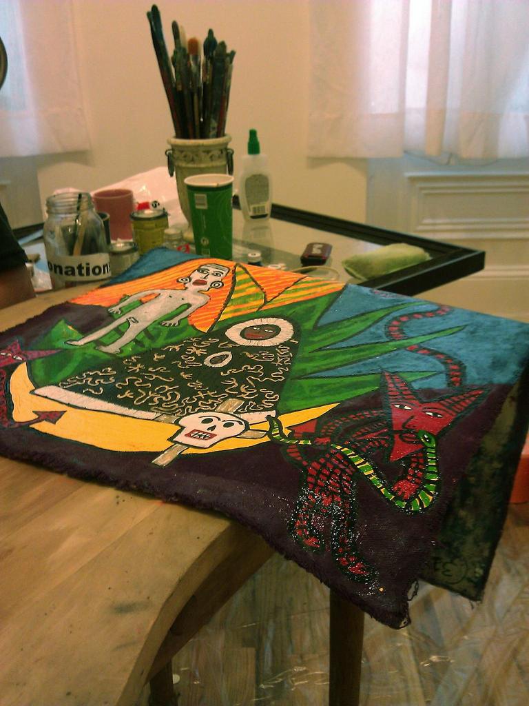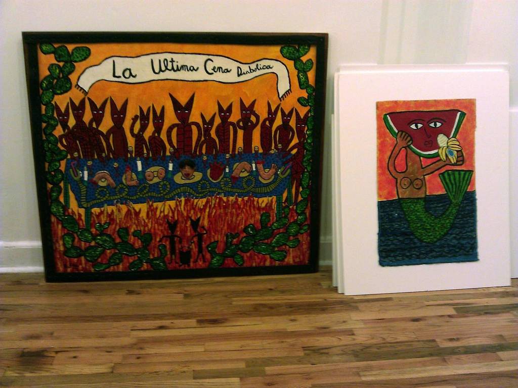 Two days before tonight’s opening, folk artist/gay activist Ralfka Gonzalez was sitting in the middle of A Seed on Diamond slipping final touches on to a painting. He was a little apologetic of as he reinterpreted the virgin’s traditional gold fleur de lis into runic gestures.