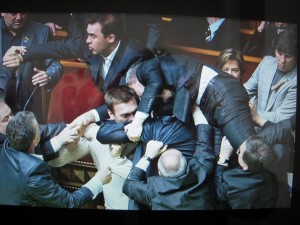 Like Umbrico, David Byrne, in “Democracy in Action,” picked a number of similar images from online sources and arrayed them together in a tight scrum of video picture frames. The images show men in suits who are duly-elected representatives of the people, fighting in their legislative chambers. Again, it’s the universality that’s the focus. Without knowing anyone’s name, these are guys anywhere in the world brawling about stuff that really, really matters to them (whatever that may be). A couple of the images seem — except for the suits and ties — right out of a Romantic era history painting.
