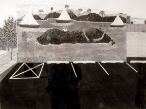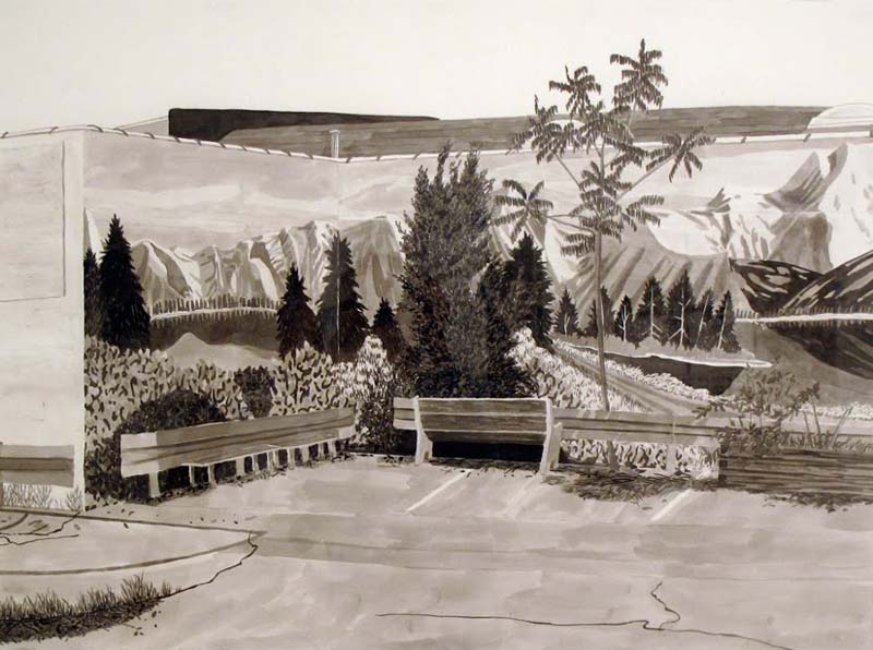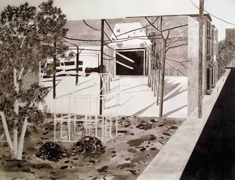 Imagine waking up from a vivid black-and-white dream, in which you explored a recognizable yet distant city dense with foliage and structure, where the most intricate details were highlighted despite a sunless, cloudy sky, and you weren’t quite sure whether you were looking at a mural or real life. This is exactly how I felt when first viewing Becky Suss’ drawings, on display at Vox Populi. Her landscape drawings, void of any human activity, made me reminisce about being a child and exploring the depths of my grandma’s backyard, or weaving in and out of the strange apartment complex I once lived in. I felt alone, unsure, but happy to be on a strange adventure. There is something quite powerful about these drawings, although I might be biased since they brought up so many wonderful childhood memories. Suss’ ability to create something so simultaneously strange, empty, familiar, and beautiful is impressive, and that isn’t even taking into consideration her particular, obsessive details, where clusters of tiny marks make up a section of tree or ground.